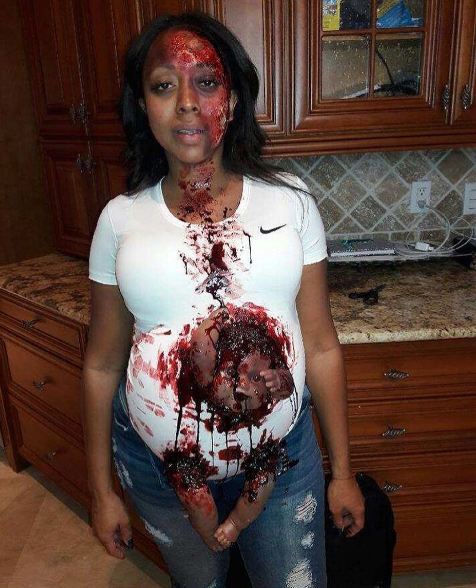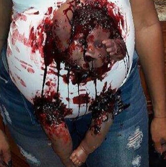 Vick who is pregnant and due in about two weeks, decided to use a costume where a baby in her womb looks like he's popping out from the pregnant bump with blood all over.