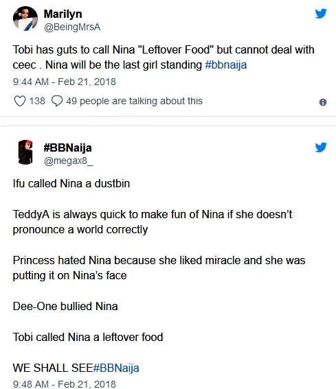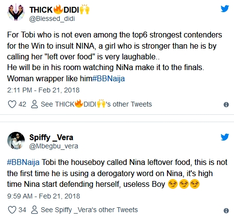 Angry Nina fans who are completely pissed at Tobi for insulting and belittling their girl online are now fighting her battles for her on Twitter.