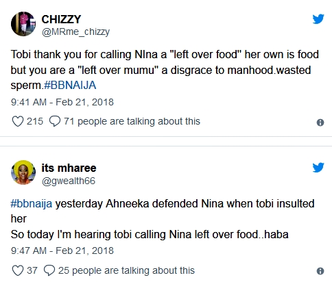 The handsome housemate was trailed with criticisms from online users who are watching the reality television after Tobi was heared calling fellow housemate, Nina who was earlier romantically linked with Miracle, a "left over food."