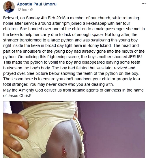 According to the pastor, a young boy was allegedly almost swallowed by a stranger who "transformed into a python" in a tricycle (Keke Napep) on Sunday 4th Feb 2018, before the mother screamed Jesus and rescued him.