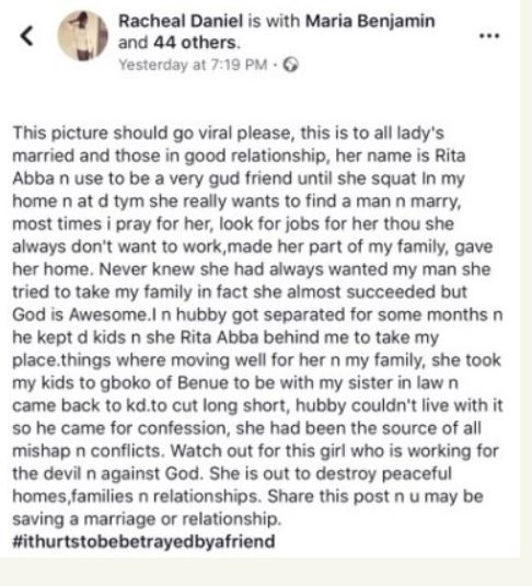 “This picture should go viral please, this is to all lady’s married and those in good relationship, her name is Rita Abba n use to be a very gud friend until she squat In my home n at d tym she really wants to find a man n marry, most times i pray for her, look for jobs for her thou she always don’t want to work,made her part of my family, gave her home. Never knew she had always wanted my man she tried to take my family in fact she almost succeeded but God is Awesome.