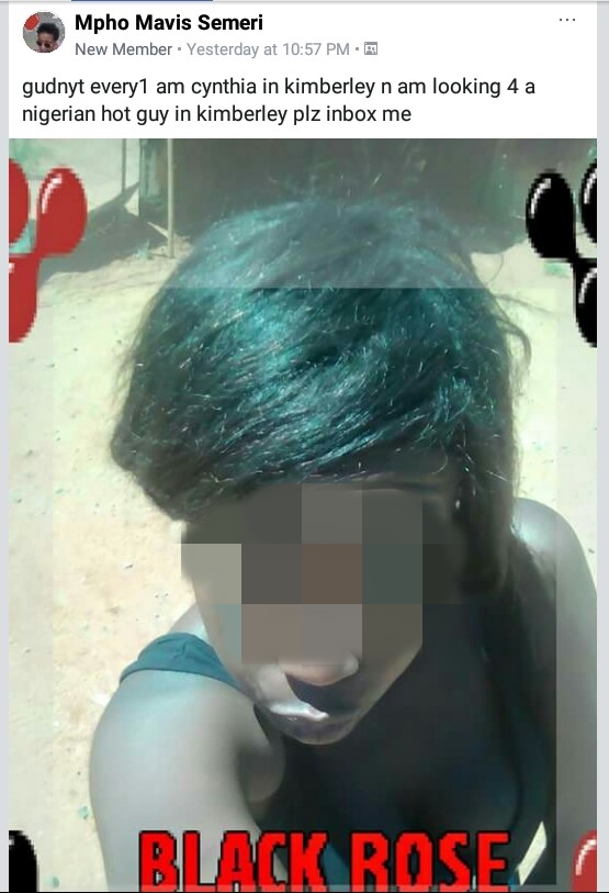 She posted her photo and wrote: "Gudnyt every1 am cynthia in kimberley n am looking 4 a nigerian hot guy in kimberley plz inbox me."