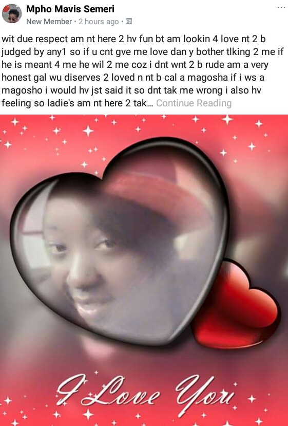 "Wit due respect am nt here 2 hv fun bt am lookin 4 love nt 2 b judged by any1 so if u cnt gve me love dan y bother tlking 2 me if he is meant 4 me he wil 2 me coz i dnt wnt 2 b rude am a very honest gal wu diserves 2 loved n nt b cal a magosha if i ws a magosho i would hv jst said it so dnt tak me wrong i also hv feeling so ladie's am nt here 2 tak ur men i wnt my own."
