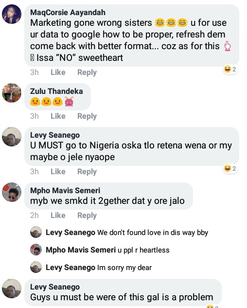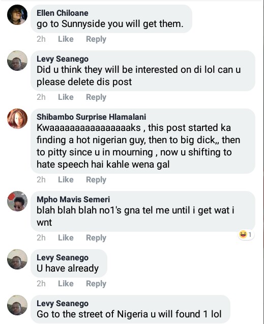 A young lady identified as Mpho Maris Semeri, from Kimberley, Northern Cape area of South Africa, has taken to a Nigerian-South African Facebook page on Tuesday night in search of a cute Nigerian man who is heavily endowed below.