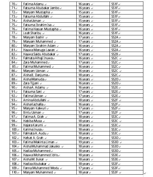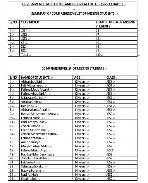 Read Full List Of Names And Details Of The 110 Missing Yobe Schoolgirls