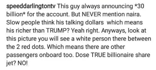 He posted a photo of Davido in a private jet and wrote: “This guy always announcing *30 Billion* for the account. But never mention naira. Slow people think his talking dollars which means his richer than TRUMP?