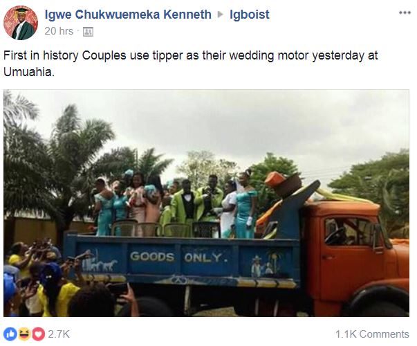 A Nigerian couple is trending on social media after they reportedly used a tipper to wed in Abia State. The groom, his bride and bridal maids could be seen on top of the tipper as friends and family members tried to take photos of them.