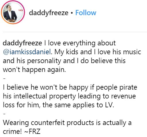 One of Nigeria's most popular On Air Personalities, Daddy Freeze, has called out Nigerian singer Kiss Daniel for allegedly wearing a fake LV shirt.
