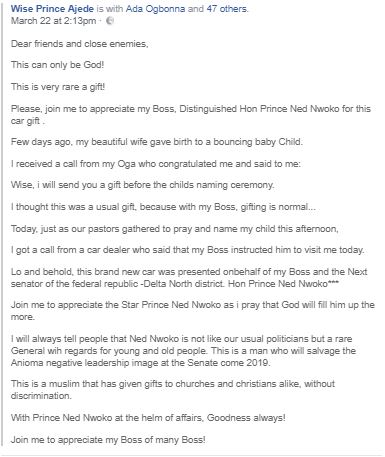 Please, join me to appreciate my Boss, Distinguished Hon Prince Ned Nwoko for this car gift .