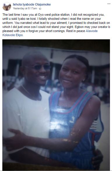 Writing about the sad news, Ishola said: "The last time I saw you at Oyo west police station, I did not recognized you, until u said Iyabo se kosi. I totally shocked when i read the name on your uniform. You narrated what lead to your ailment, I promised to checked back on which I did just once cos I could not stand your sight. Egbon may your creator b pleased with you n forgive your short comings. Rest in peace Alawode Kolawole Ekpo."