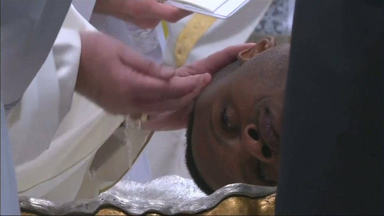 Nigerian John Francesco Ogah stands during a solemn Easter vigil ceremony in St. Peter's Basilica at the Vatican on Saturday. Ogah has been called a hero for helping police arrest a thief outside a supermarket in Rome. (Fabio Frustaci/EPA-EFE)