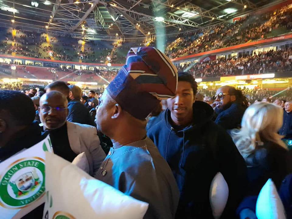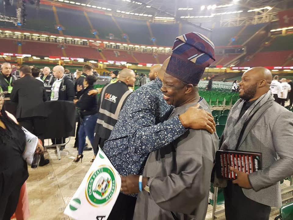 Ogun State Governor, Ibikunle Amosun has met and posed with superstar world boxing champion, Anthony Joshua in Cardiff. Amosun had led a delegation to Cardiff, Wales to watch and cheer Anthony Joshua to victory over the weekend.