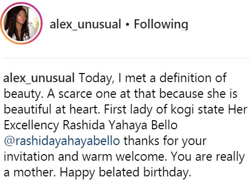 "Today, I met a definition of beauty. A scarce one at that because she is beautiful at heart. First lady of kogi state Her Excellency Rashida Yahaya Bello @rashidayahayabello thanks for your invitation and warm welcome.
