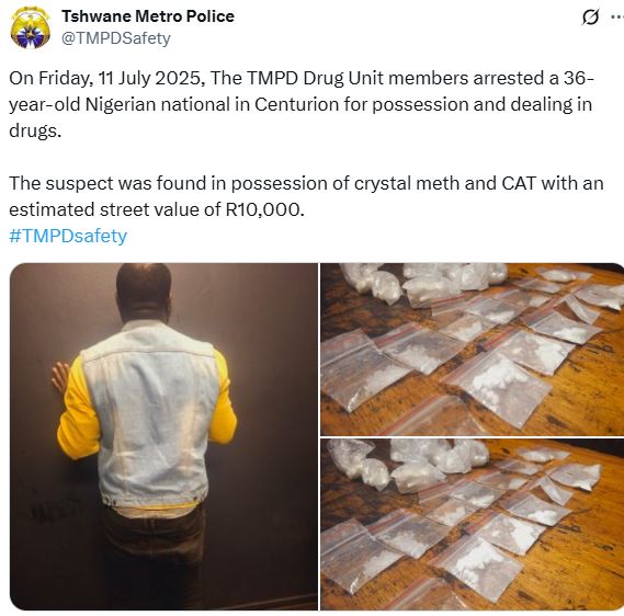 "On Friday, 11 July 2025, The TMPD Drug Unit members arrested a 36-year-old Nigerian national in Centurion for possession and dealing in drugs," the statement read.