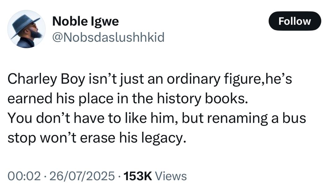 Reacting via his X handle, Noble argued that Charly Boy has earned his place in the books of Nigerian history. He went on to state that even if not liked, renaming a bus stop will in no way erase Charly Boy’s legacy.