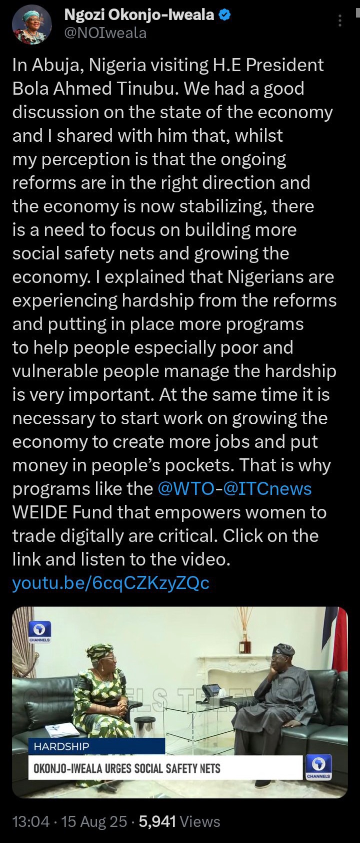 The Director-General of the World Trade Organisation, Dr. Ngozi Okonjo-Iweala has released a statement on X, explaining her visit to President Bola Tinubu.