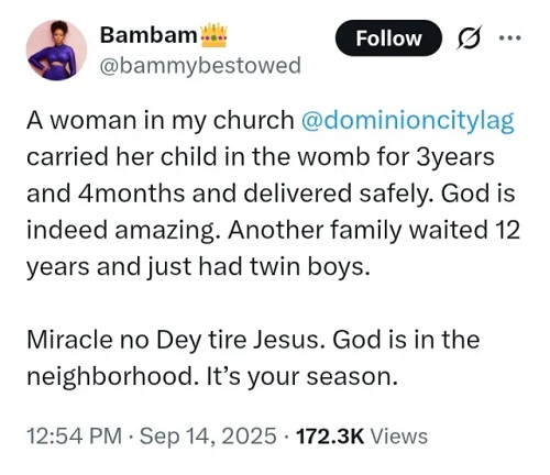 Bambam wrote, “A woman in my church @dominioncitylag carried her child in the womb for 3years and 4months and delivered safely. God is indeed amazing. Another family waited 12 years and just had twin boys. Miracle no Dey tire Jesus. God is in the neighborhood. It’s your season.”