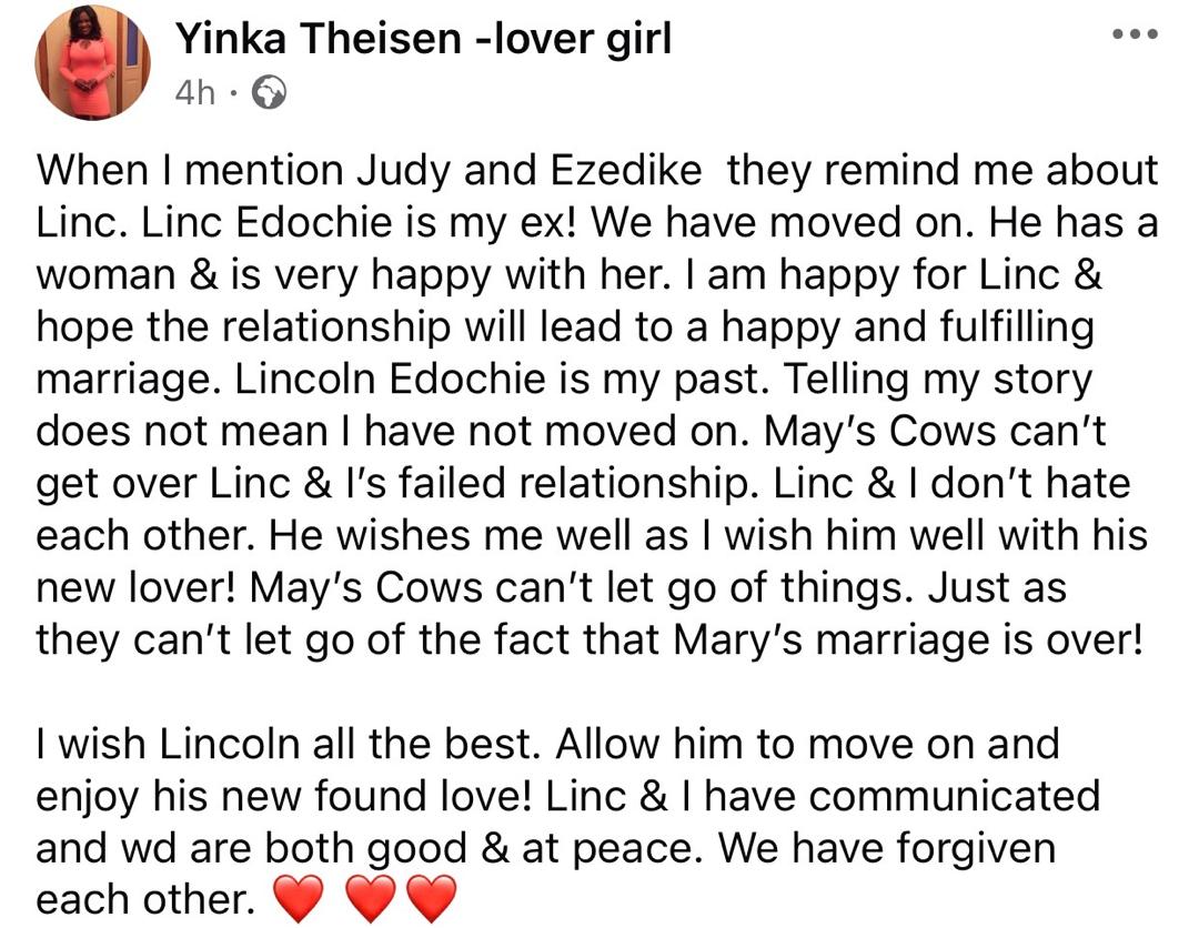 Yinka Theisen, the ex-fiancee of actor, Linc Edochie has given an update concerning her estranged relationship.