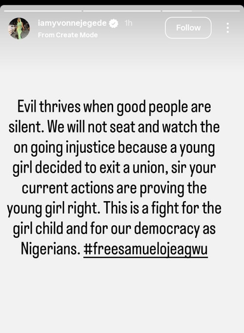 “Evil thrives when good people are silent. We will not sit and watch the ongoing injustice because a young girl decided to exit a union. Sir, your current actions are proving the young girl right. This is a fight for the girl-child and for our democracy as Nigerians. #freesamuelojeagwu”