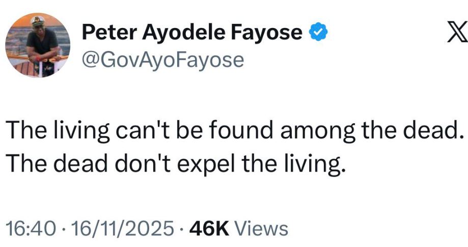 Responding via his X handle, Fayose said the “dead cannot expel the living.”