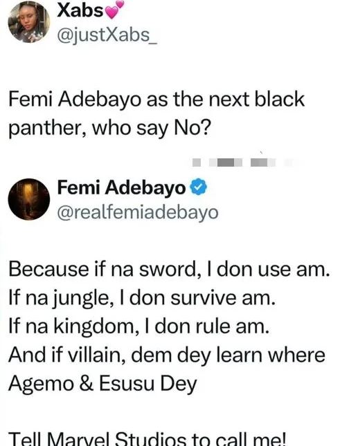A Twitter user, @justXabs_ had made the suggestion on the platform stating, “Femi Adebayo as the next Black Panther, who say No?”