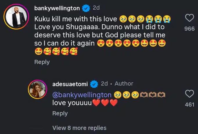 Her message drew an emotional response from Banky W, who commented, “Kuku kill me with this love. Love you, Shuga.