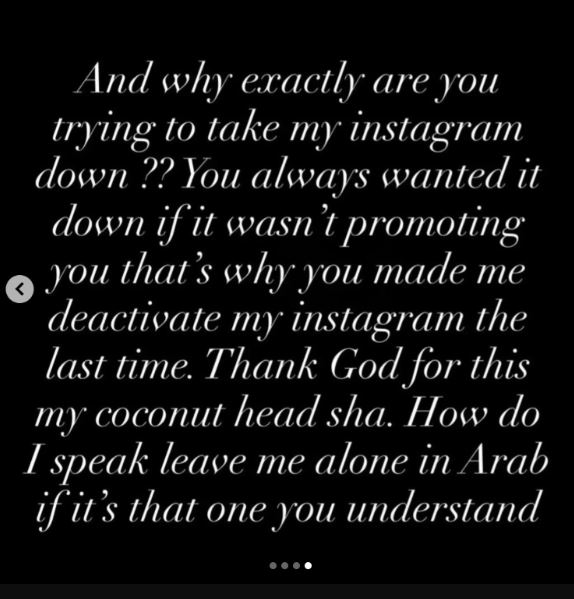 In the latest update, she accused him of trying to take down her Instagram page: “And why exactly are you trying to take my Instagram down? You always wanted it down if it wasn’t promoting you. That’s why you made me deactivate my Instagram the last time.