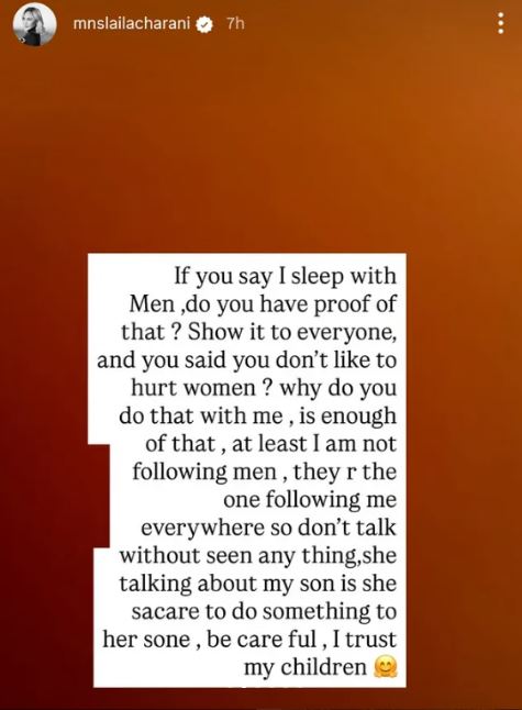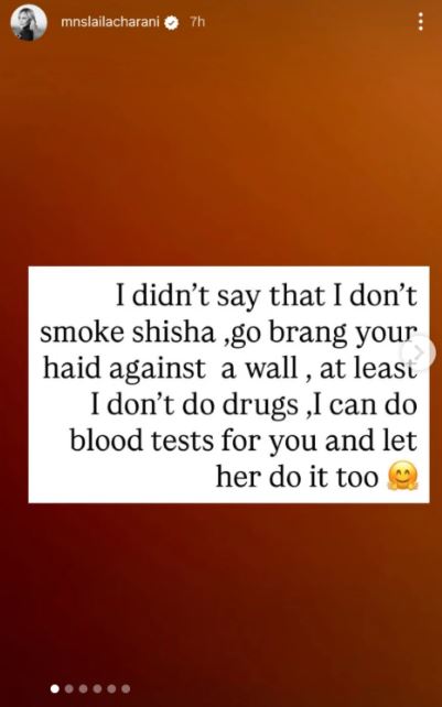 In her posts, Laila clarified that she never denied smoking shisha but insisted she does not do drugs, adding that she is willing to take a blood test and wants Regina to do the same.