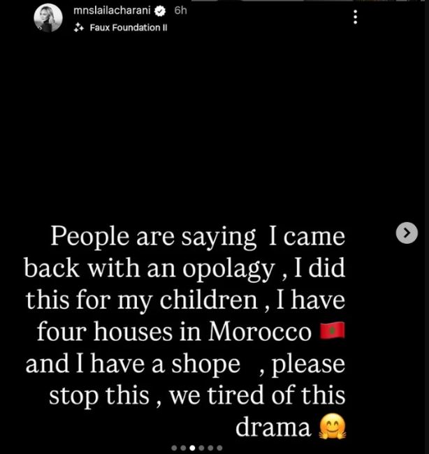 Laila went on to say she returned for the sake of her children, adding that she owns houses and a shop in Morocco and is tired of the ongoing drama.
