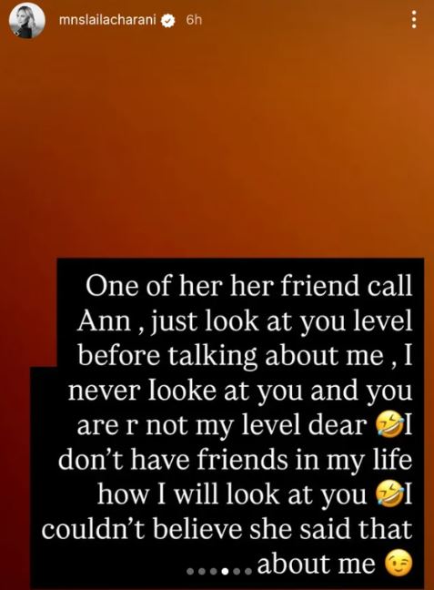 She also addressed a comment allegedly made by someone named Ann, saying they are not on the same level and insisting she has no friends, so she couldn’t have been looking at anyone.
