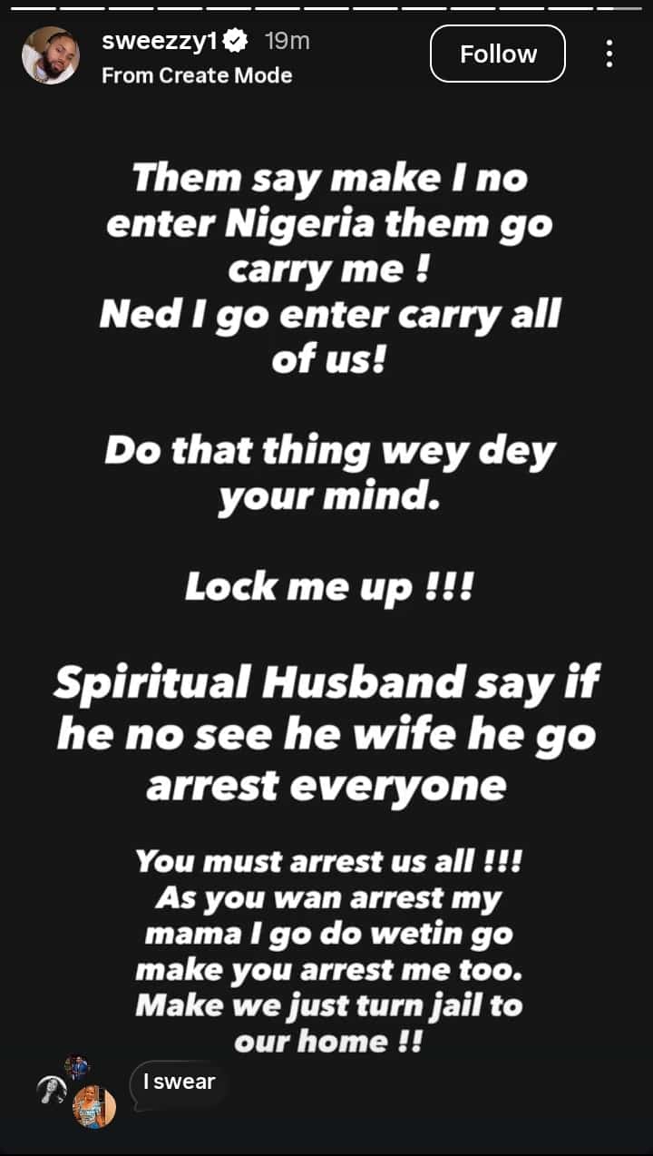 Spiritual husband says if he no see his wife, he go arrest everyone.