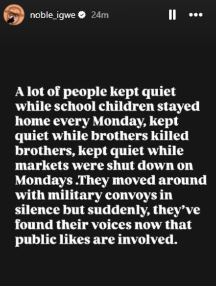 Noble Igwe in a post on his Instagram story, said a lot of people who kept silent amid the shut down of schools every Monday and the k!llings by rampaging unknown gunmen have suddenly found their voices following the conviction.