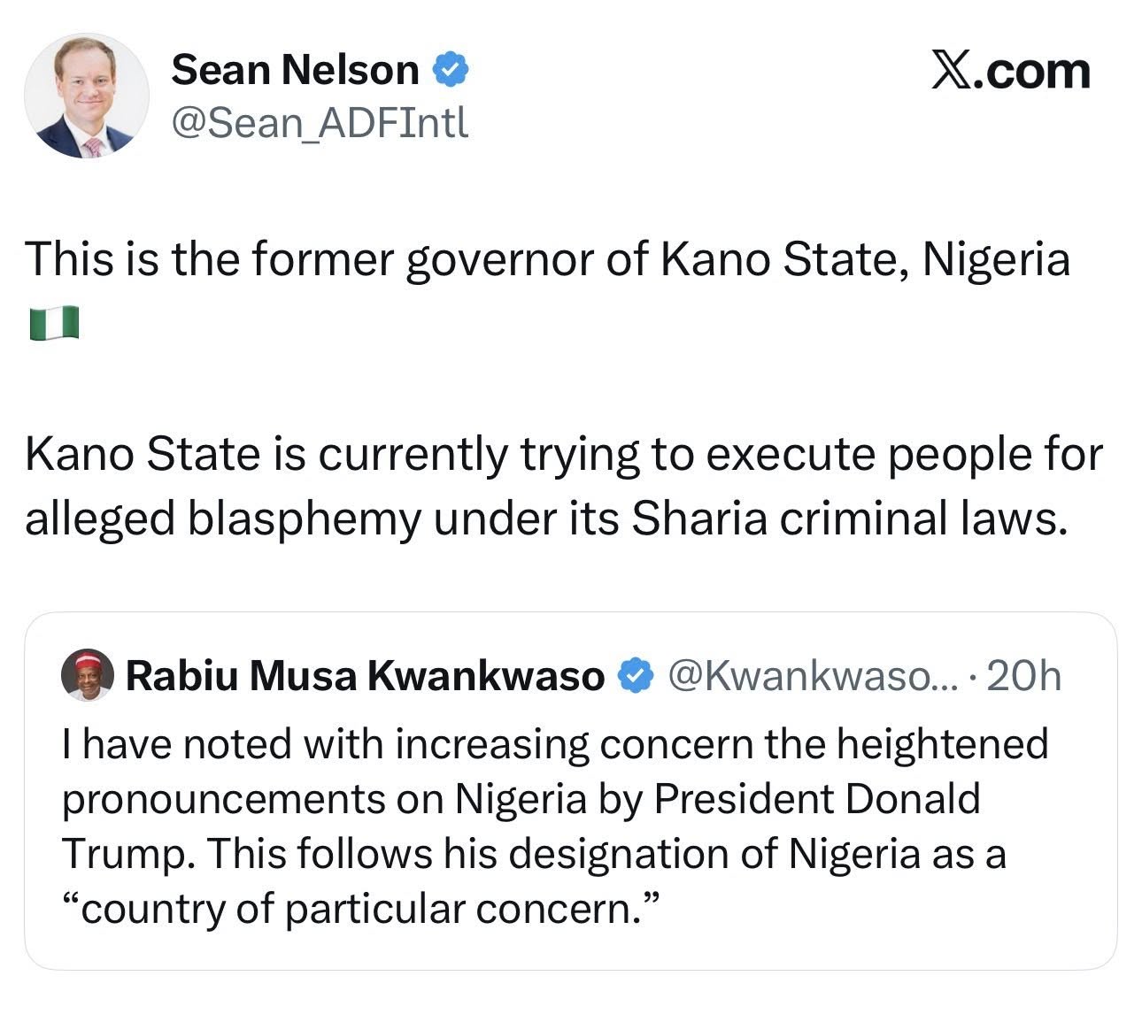 This is a former Governor of Kano state which is currently trying to execute people for alleged blasphemy under its Sharia criminal laws - Senior Counsel at Global Religious Freedom Sean Nelson calls out Rabiu Kwankwaso.