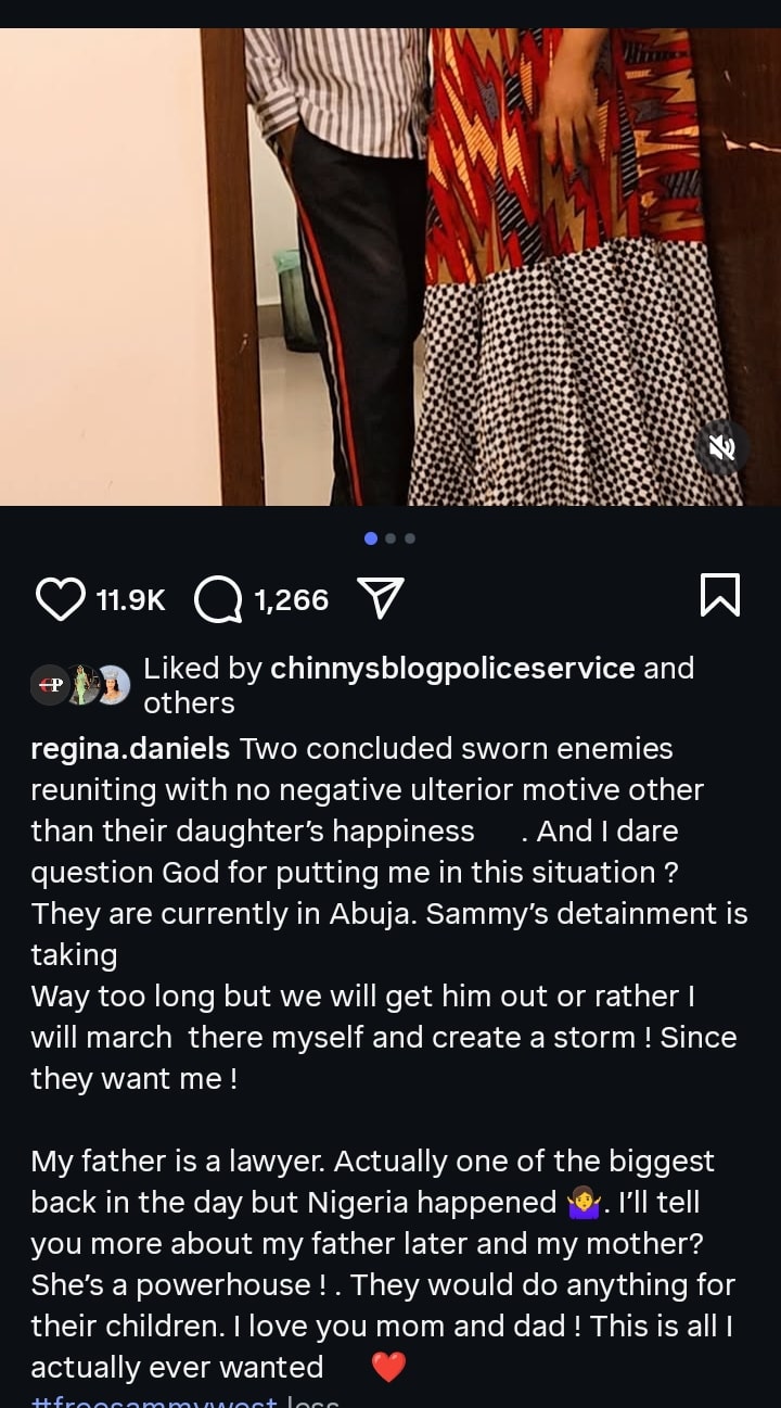 Nollywood actress Regina Daniels has celebrated after her parents reunited following the arrest of her brother, Sammy West.