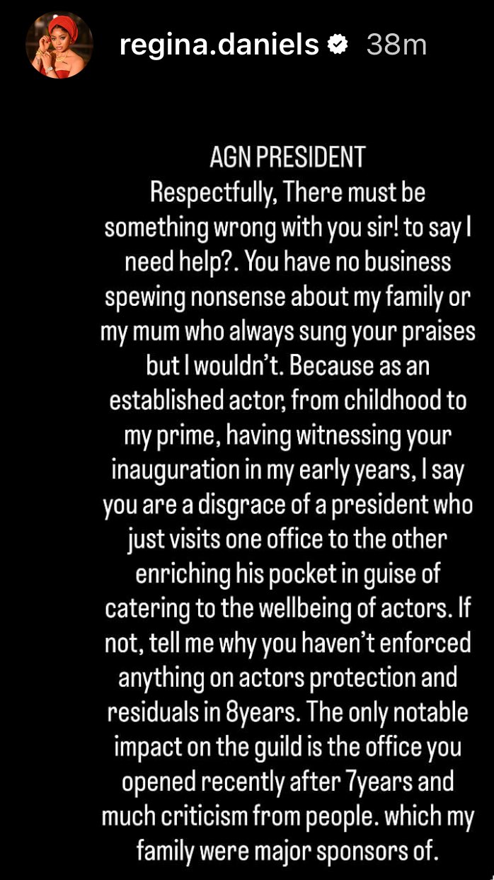 She wrote, “AGN President, respectfully, there must be something wrong with you sir! To say I need help? You have no business spewing nonsense about my family or my mum who always sung your praises but I wouldn’t because as an established actor from childhood yo my prime, having witnessing your inauguration in my early years, I say you are a disgrace of a president who just who just visits one office to the other enriching his pocket in guise of catering to the wellbeing of actors. If not, tell me why you haven’t enforced anything on actors protecting and residual in 8 years.