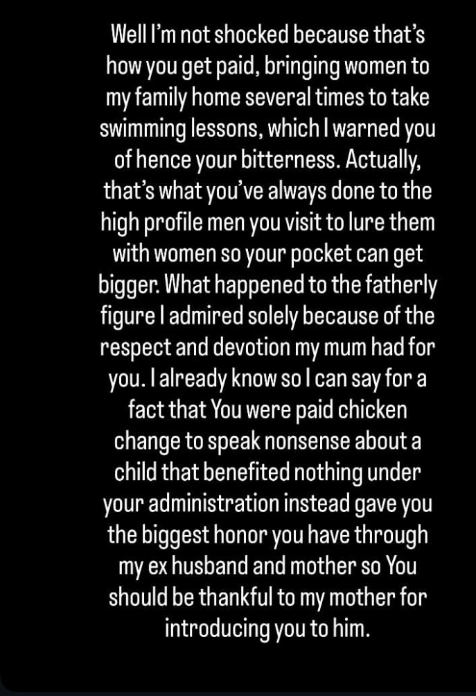 “What happened to the fatherly figure I admired solely because of the respect and devotion my mum had for you. I already know so I can say for a fact that you were paid chicken change to speak nonsense about a child that benefited under your administration instead gave you the bigger honour you have through my ex-husband and mother so you should be thankful to my mother for introducing you to him. I’m still in awe that you would try to discredit my mother’s election and diminish her efforts after all she has done for you.