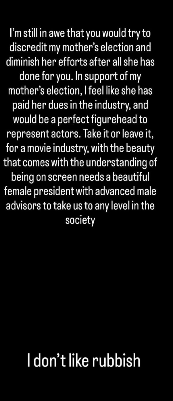 “In support of my mother’s election, I feel like she has paid her dues in the industry and would be a perfect figurehead to represent actor. Take it or leave it for a movie industry with the beauty that come with the understanding of being on screen needs a beautiful chair lady with advanced male advisors to take us to any level in the society. I don’t like rubbish. (Sic)”