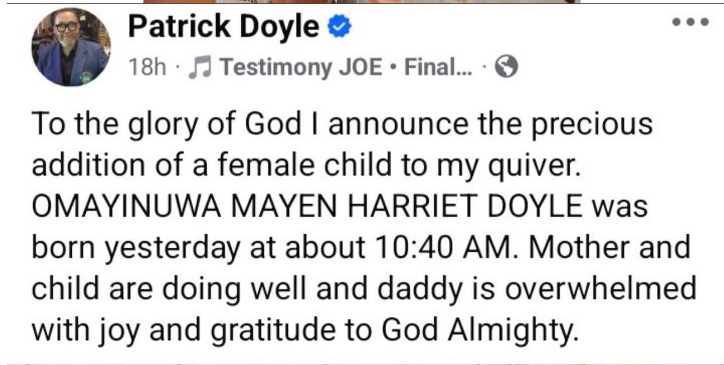 Doyle, who is widely respected in the Nigerian entertainment industry for his decades-long career in acting, broadcasting, and public speaking, has often kept his private life relatively low-profile. However, this announcement marked a rare and heartfelt public sharing of family joy.